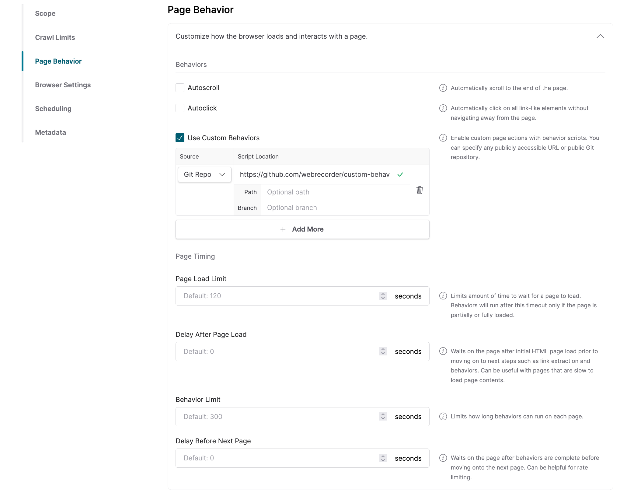 You’ll now find everything related to behaviors in the new Page Behavior section of the crawl workflow editor. This update combines our new autoclick behavior and support for custom behaviors with existing settings like autoscroll, page timeouts, and delays (which were previously scattered across the workflow editor).